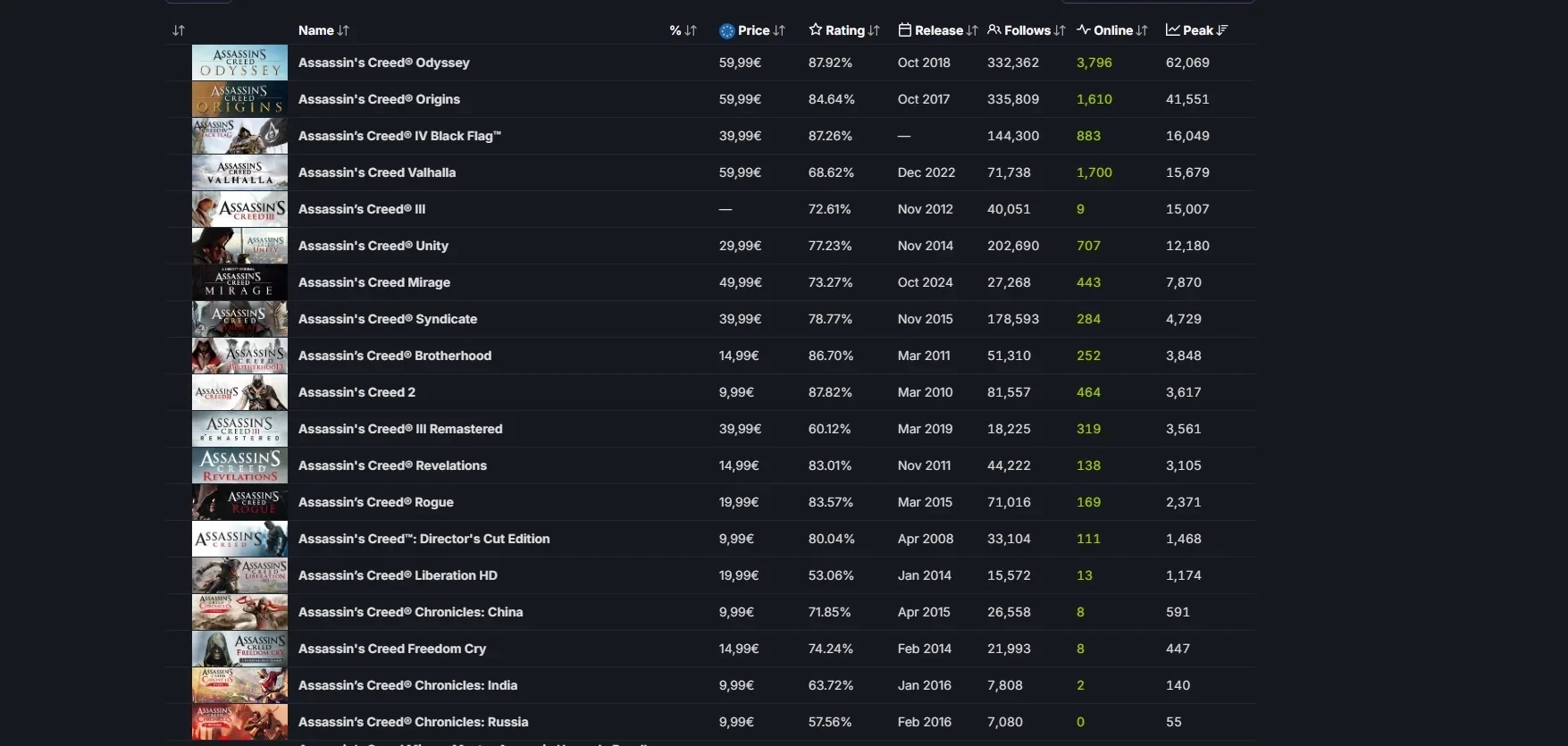 В целом, когда дело касается онлайна в Steam, серия Assassinʼs Creed, как мы видим, звёзд с неба не хватает.