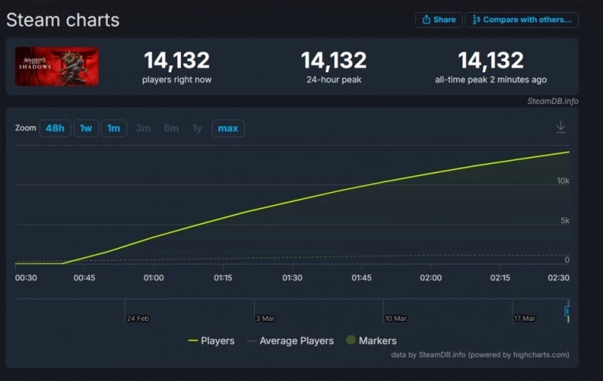 Пиковый онлайн Shadows в Steam медленно поднимается и сейчас составляет 14 132 игроков одновременно. Стартовый пользовательский рейтинг — «в основном положительный» на основе всего 30 обзоров, в которых пока мало конкретики.