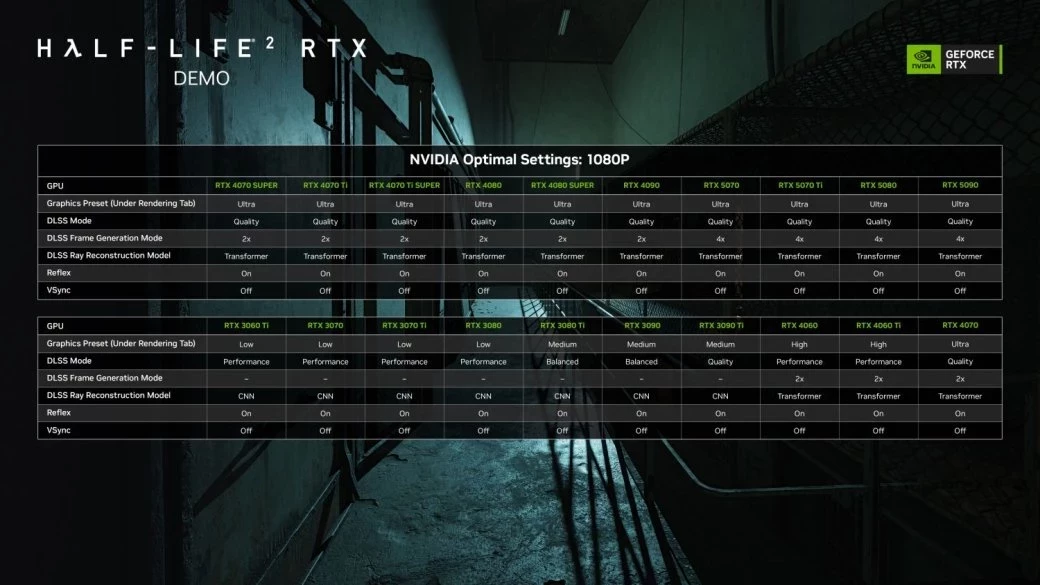 К таблице системных требований моддеры добавили ряд таблиц, в которых указаны наилучшие настройки качества для разных моделей видеокарт Nvidia. Набор пресетов настроек имеется и в самом моде, его можно открыть комбинацией клавиш Alt+X.