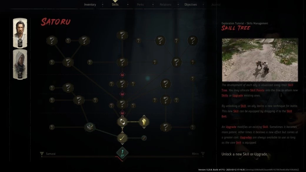 2 фотоЧуть выше я написал о потенциальных новых умениях героев. Вот, к примеру, два дерева развития основных персонажей. Обратите внимание на шкалу в самом низу: она показывает характер протагониста. Мы видим, что Сатору может идти по пути самурая или действовать в духе бесславного ронина, а Акира может сохранять хладнокровие или быть теплосердечным.