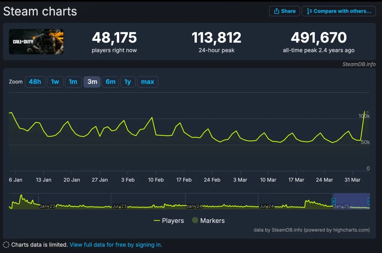 Релиз третьего сезона в Warzone и Call of Duty: Black Ops 6 помог и числу одновременных игроков в Steam, которое подскочило более, чем на 200% (по сравнению с предыдущим периодом).