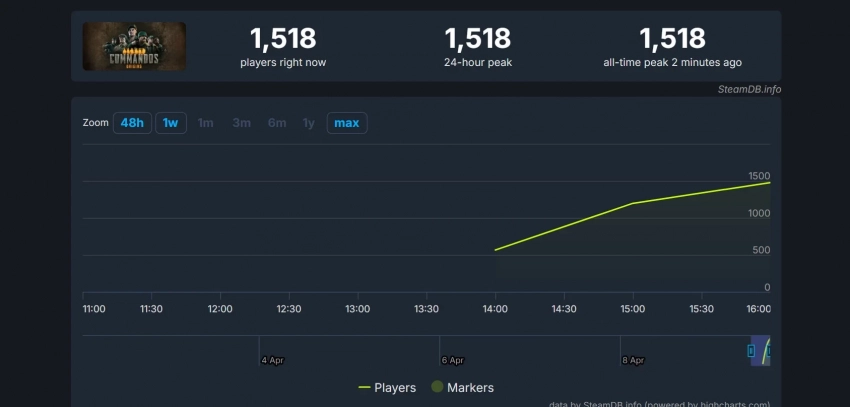 Что касается стартового пикового онлайна Steam, то он превысил 1500 человек. Вполне достойный результат для нишевых игр издателя Kalypso Media — рекорд принадлежит Tropico 6, в которую одновременно играло свыше 15 тысяч человек. Commandos: Origins смогла опередить Commandos 2 - HD Remaster (848 человек на пике) и приключенческий экшен The Inquisitor (193 человека).
