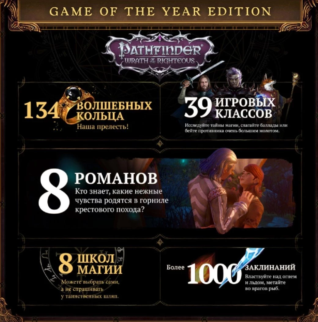 Ещё в Pathfinder: Wrath of the Righteous есть целых восемь школ магии, а при желании получиться обучиться более тысяче заклинаний. Это будет как стихийная магия, вроде огненных или ледяных атак, так и что-то экзотическое. К примеру, возможность метаться во врагов рыбами. А усилить магические таланты смогут волшебные кольца — «прелестей Голлума» насчитывается 134 штуки.