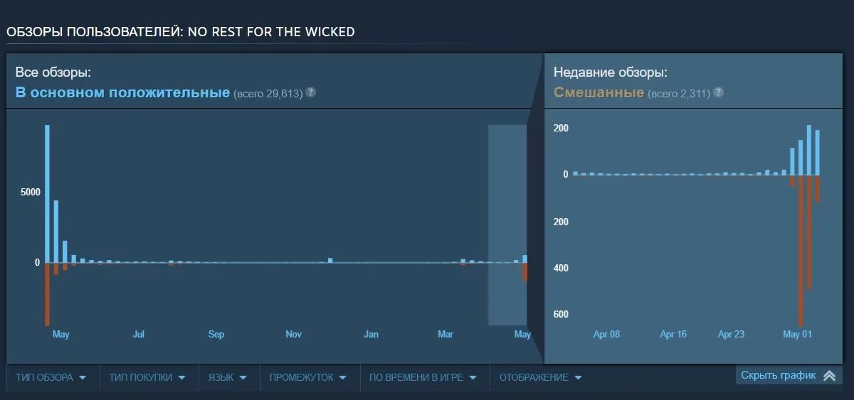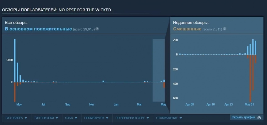 Ещё больше интересных видео на YouTube канале Игромании!Скриншот No Rest for the WickedВ конце апреля студия Moon выпустила обновление The Breach к хардкорному ролевому боевику No Rest for the Wicked. И внесённые им новшества не пришлись по душе игрокам: рейтинг игры в Steam за несколько дней съехал до смешанного с 41% рекомендаций.