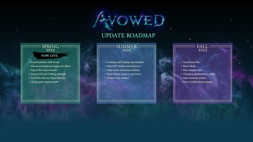 Obsidian также опубликовала свои планы развития Avowed на ближайшие месяцы. Летом нас ждёт появление пользовательских маркеров на карте, а также улучшение ремёсел и новые навыки. А на осень запланировано обновление с фоторежимом, новым типом оружия, дополнительными пресетами персонажей и прочими новшествами.