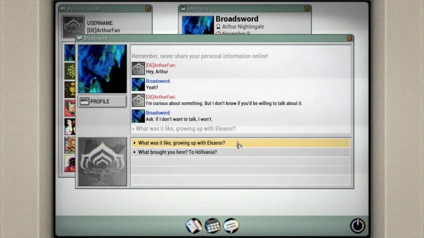 Речь идёт про текстовое общение между персонажами в чате. По словам творческого директора Ребекки Форд, авторы многому научились во время изучения игр похожего жанра — и интегрировали их сильные стороны для своего варианта в Warframe.