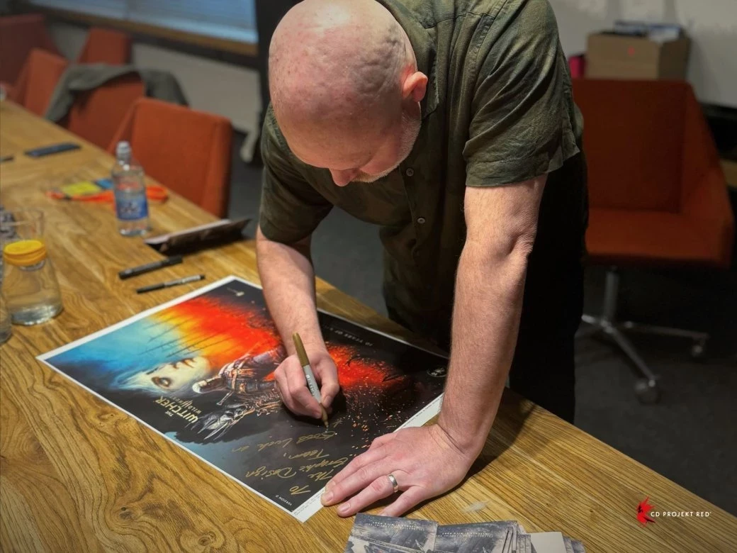 Поздравить разработчиков со знаменательным юбилеем прибыл Даг Кокл, официальный английский голос Геральта из Ривии. Он посетил студию, оставил автографы, пофотографировался и поделился воспоминаниями о процессе работы. На постере первого «Ведьмака» он написал одну из коронных фраз Геральта — Damn you are ugly! (Ну и гнусный же ты).