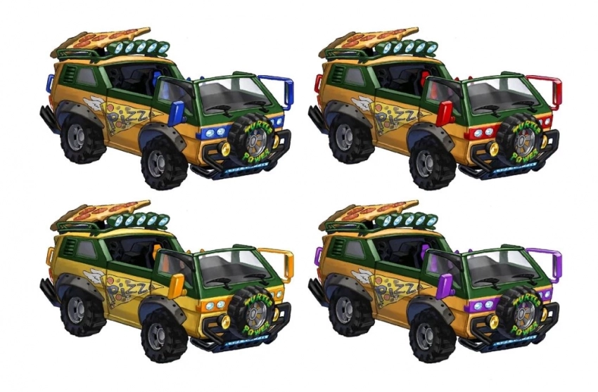 А вот материалы по «Черепашкам-ниндзя», показывающие фургон для доставки пиццы и канализацию Нью-Йорка.