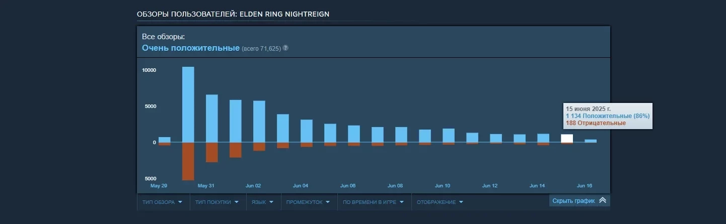 Например, за 15 июня было написано 1134 положительных обзора, а вот негативную оценку Elden Ring Nightreign получила лишь от 188 пользователей. В отрицательных рецензиях игроки ругают неудобное управление, отсутствие разнообразие в скинах персонажей, проблемы с производительностью и частые вылеты. Кому-то Nightreign не пришлась по душе из-за схожести с оригинальной Elden Ring — такие геймеры считают, что купили «дополнение» по стоимости полноценной игры.