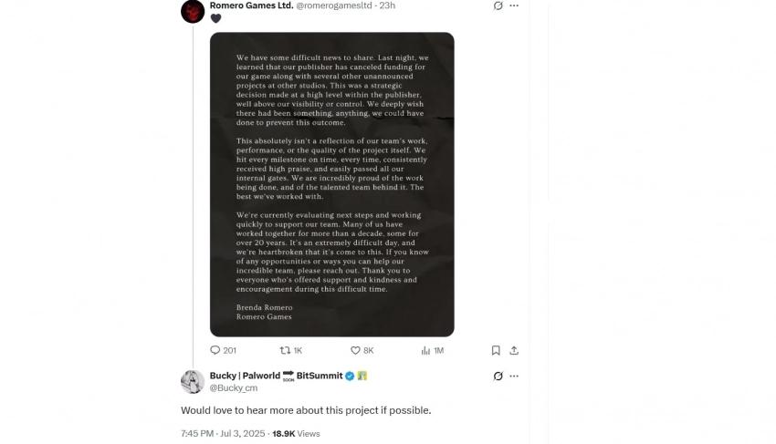 Конечно, пока у нас только есть целый твит, что не даёт каких-то гарантий сотрудничества. Но надеяться никто не запрещает, и пользователи соцсетей уже просят Баки «спасти» Romero Games.
