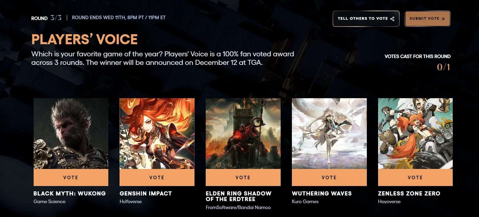 В финале голосования «Выбор игроков» на TGA 2024 сойдутся Black Myth: Wukong и Elden Ring Shadow of the Erdtree
