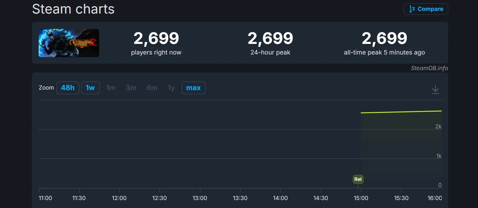 Пользовательская оценка Neverwinter Nights 2: Enhanced Edition в Steam ещё не сформирована из-за отсутствия обзоров. Однако в фэнтезийные приключения уже погрузилось почти 2700 человек — именно такого пикового онлайна игра достигла примерно за час после релиза. В ближайшие часы число должно вырасти.