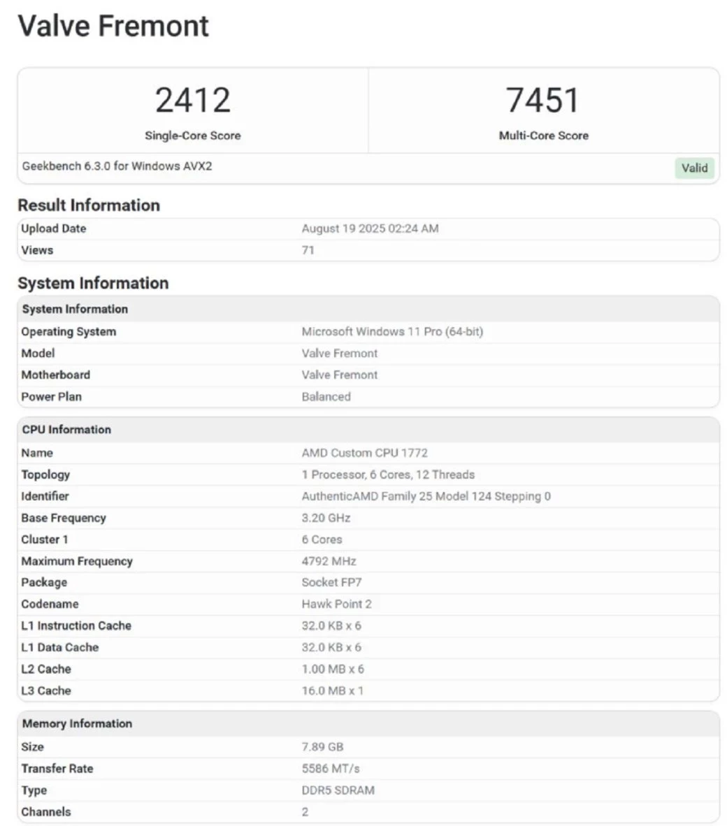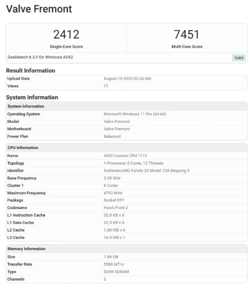 Судя по всему, для Fremont был разработан кастомный процессор, за который, как и в Steam Deck, вновь отвечала AMD. В нём будут использоваться ядра на базе Zen4. Что касается видеочипа, то данные о нём не отображаются в результатах бенчмарка, но есть в файлах Geekbench — на борту у Fremont будет Radeon RX 7600 с 8 ГБ видеопамяти.