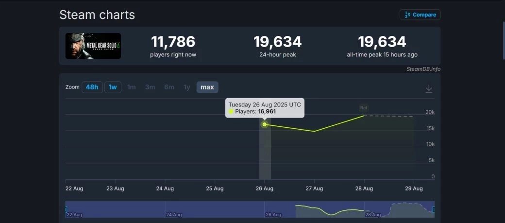 Через несколько часов после релиза в Metal Gear Solid Delta: Snake Eater находилось 19,6 тысячи игроков в Steam. Для франшизы Metal Gear это второй результат по пиковому онлайну — на первом месте гордо восседает Metal Gear Solid V: The Phantom Pain. На пике почти 10 лет назад её онлайн слегка превысил 91 тысячу человек.
