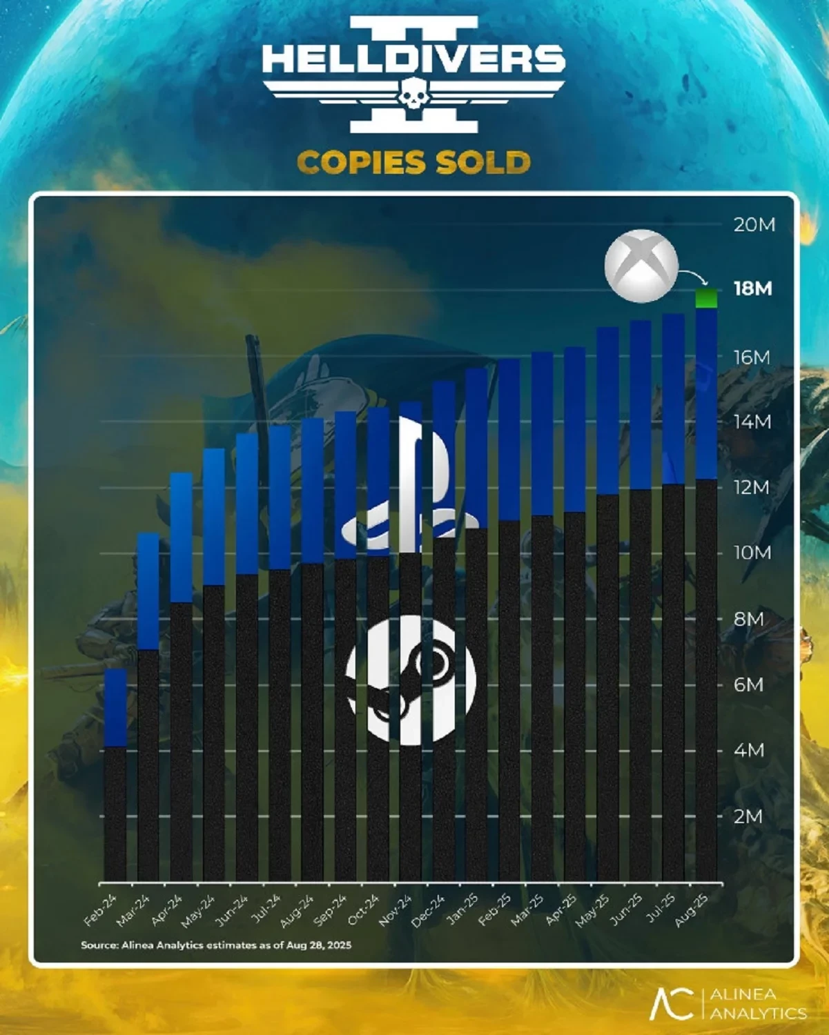 Ещё больше интересных видео на YouTube канале Игромании!Обложка: скриншот Helldivers 2Агентство Alinea Analytics поделилось своим исследованием о продажах Helldivers 2. По словам аналитиков, за три дня с момента релиза на Xbox Series (26 августа) тираж новенького порта превысил 600 тысяч копий — достойный результат и повторение ситуации, когда бывшие консольные эксклюзивы Xbox врывались в топ продаж на PlayStation 5.
