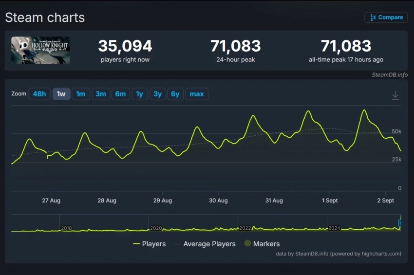Тем временем пиковый онлайн первой Hollow Knight достиг уже 71 083 игроков одновременно.