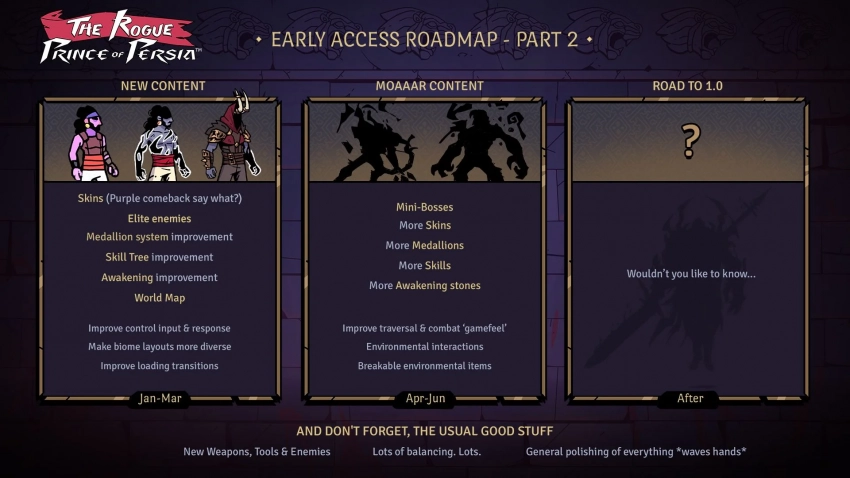 В первом квартале игроки получат более разнообразные биомы, элитных врагов, улучшения системы медальонов, дерева навыков и механики пробуждения. Нас также ждут новые скины для Принца, в том числе фиолетовый —внешний вид героя был вдохновлён первой Prince of Persia, но затем разработчики отказались от этого варианта в пользу более реалистичного.