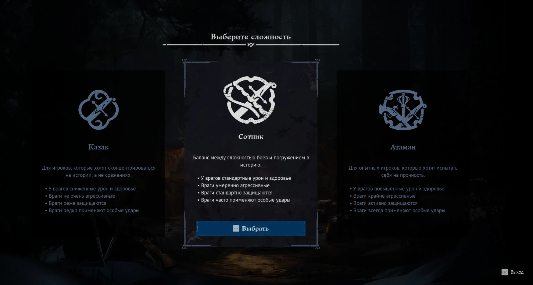 • Атаман — сложность для опытных игроков с крайне агрессивными врагами.